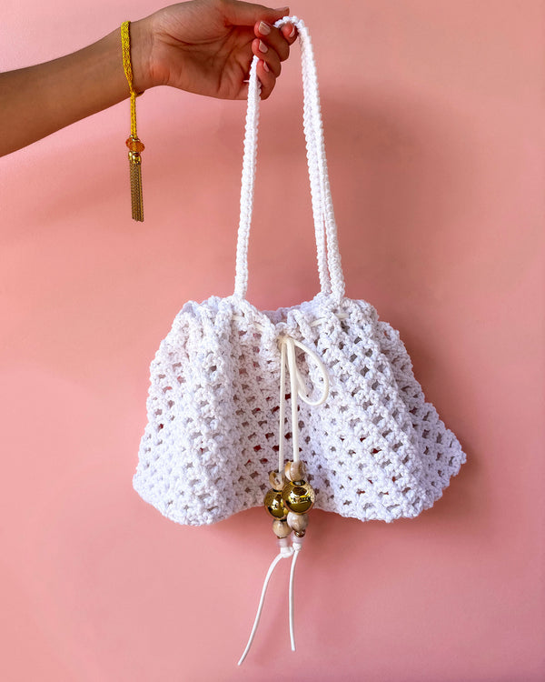 CROCHET LONG BEAD BAG - BRIGHT WHITE
