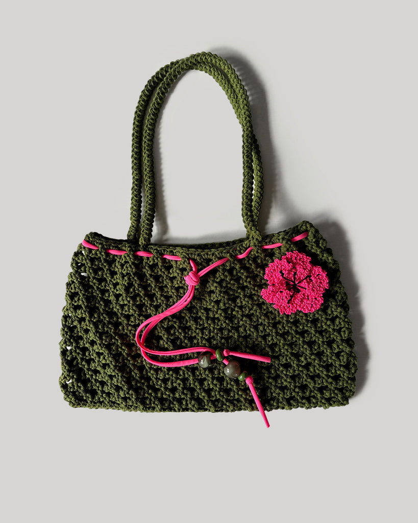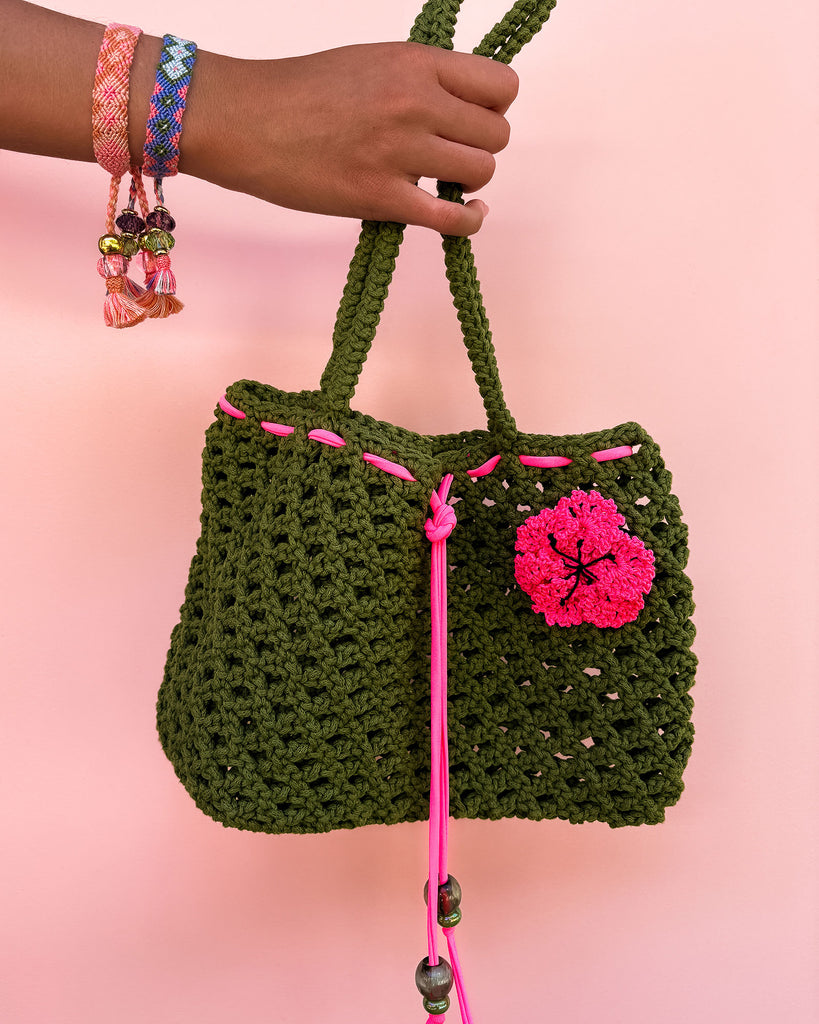 New crochet small totes with a detachable flower brooch and contrasting pink drawcords made from Lycra.