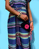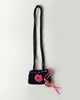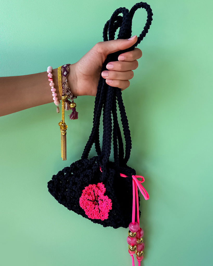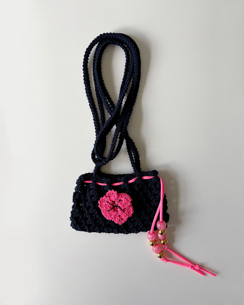 New with a detachable pink flower brooch. Small and just the right size for holiday dinners. Cross-body style with a stretchy Lycra cord and acrylic beads.