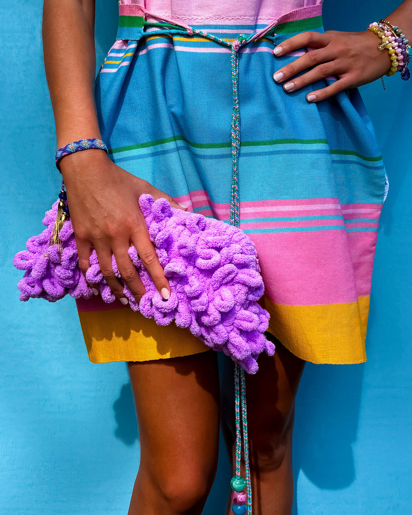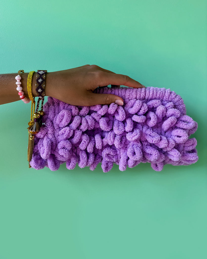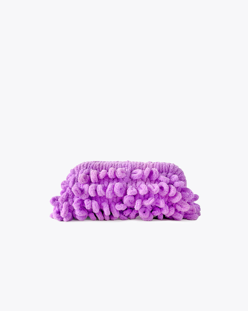Back in stock. Crocheted in a lilac chenille-like yarn this super soft clutch has a strong hinged clasp and is fully lined.