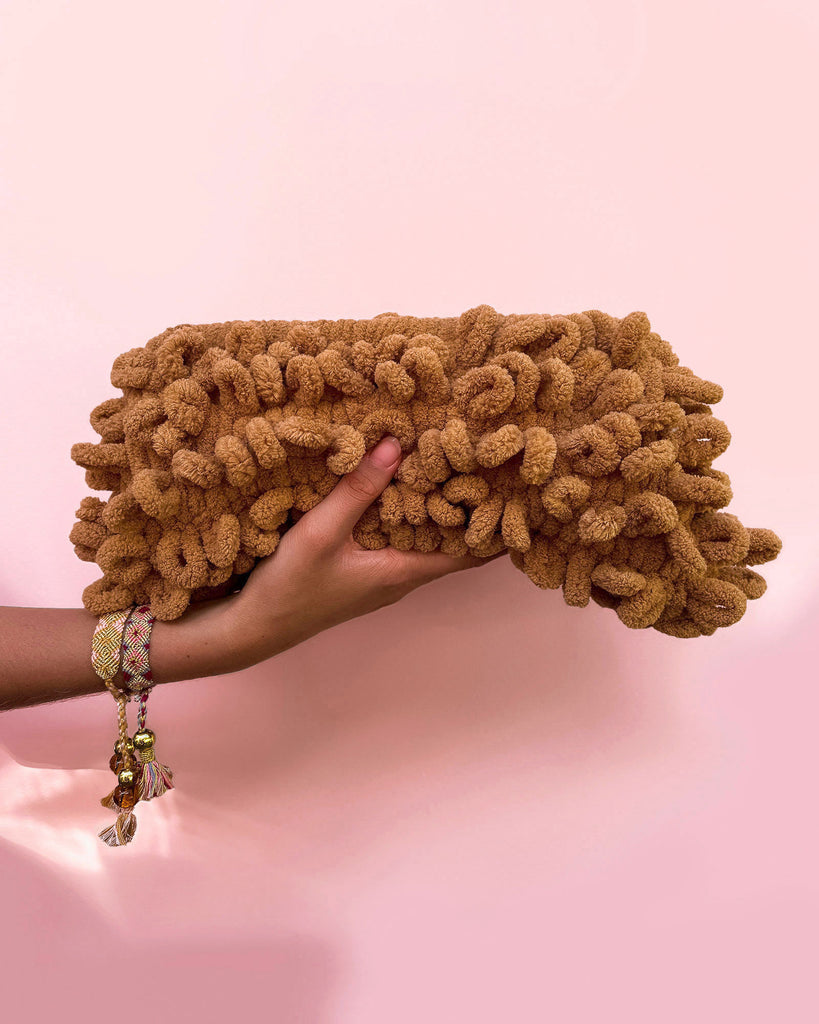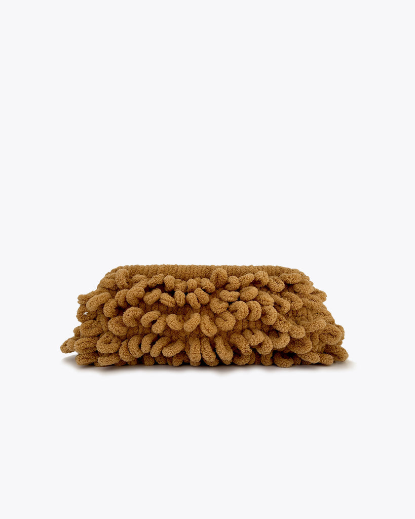 Super fluffy chenille-like looped crochet clutch with a strong hinged clasp in a soft tan colour. Lined in cotton.