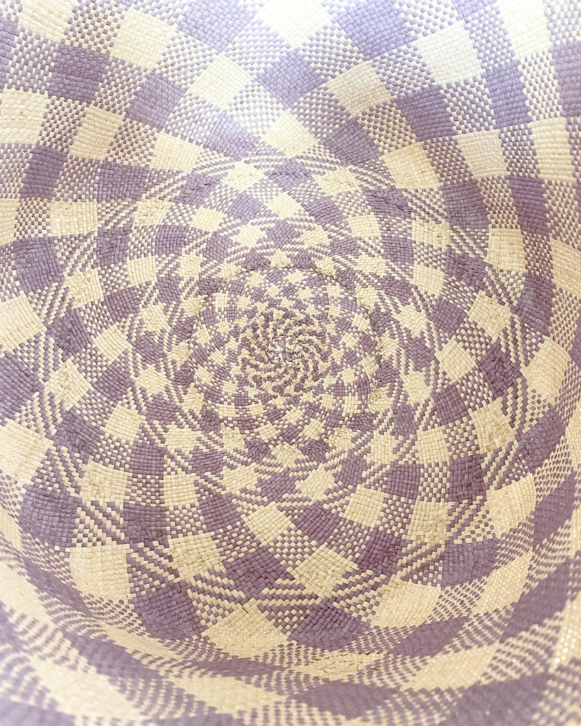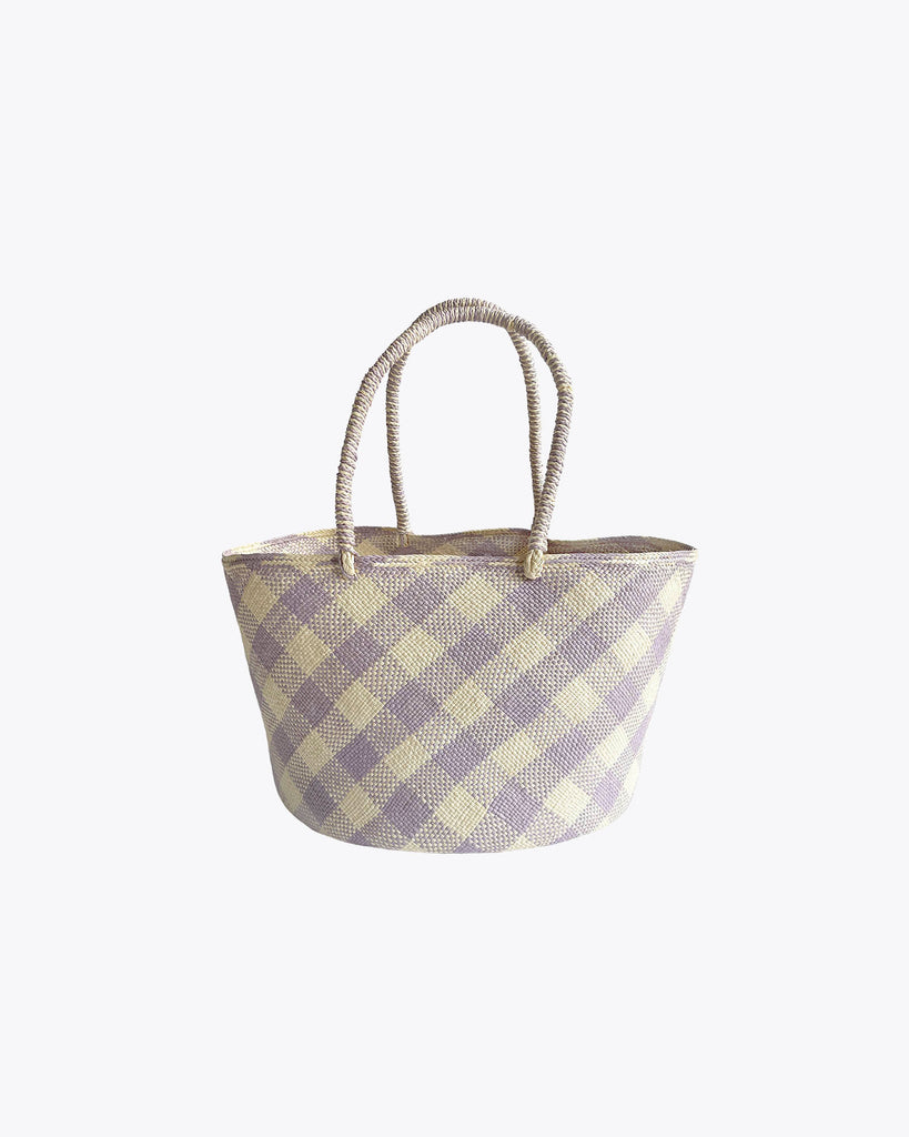 Featuring a classic gingham pattern woven in both a natural and lilac dyed straw. The work is so beautiful up close. Featuring our favourite round base and coiled straw handles.