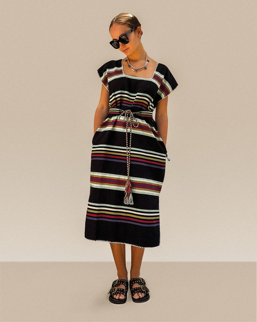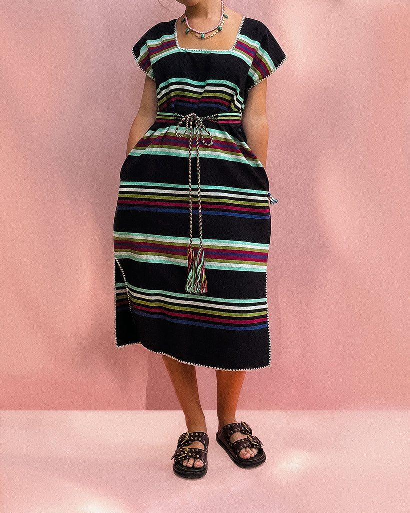 Two side splits and side pockets. Hand stitched edges. Black with cream, maroon, navy, khaki and mint stripes.