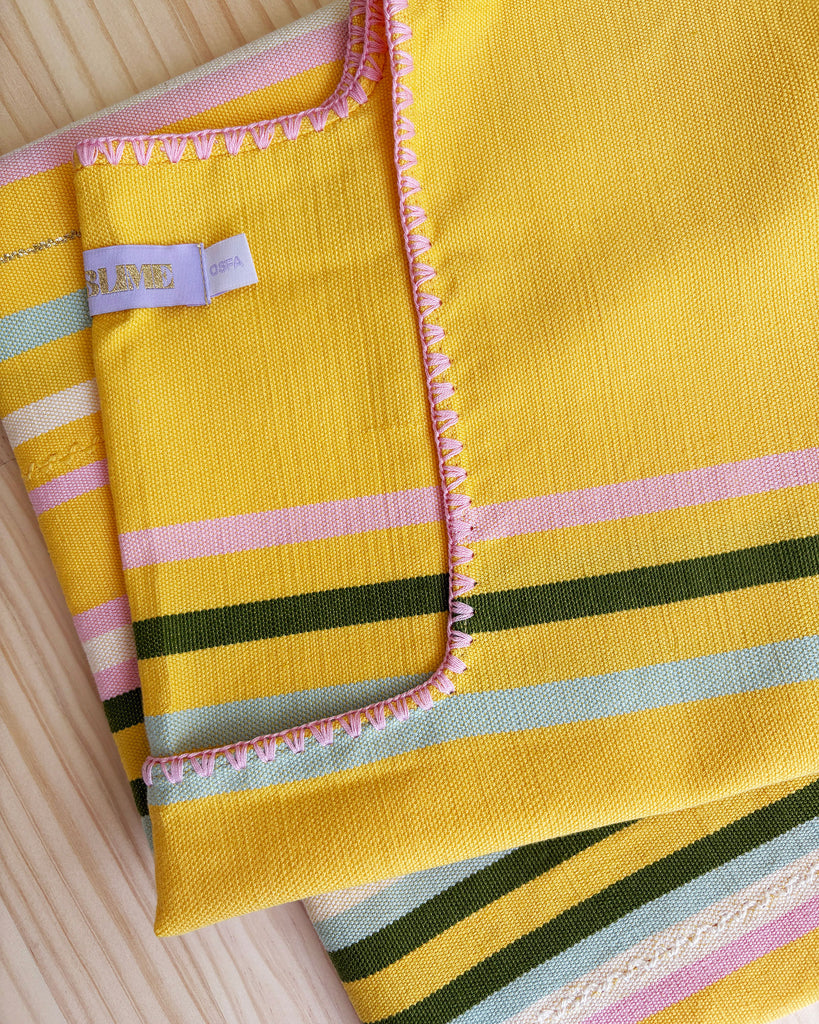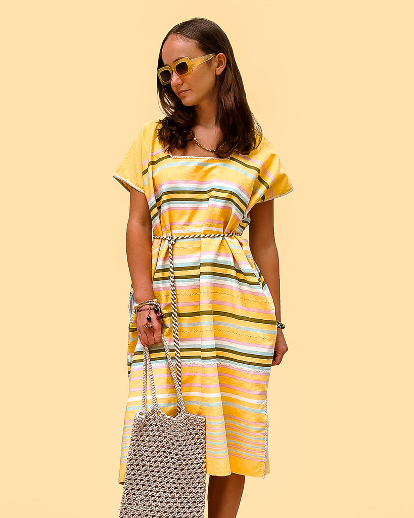 Two side splits and side pockets. Hand stitched edges. The prettiest shade of yellow with khaki, pastel pink, blue and white stripes and fine gold highlight stripes.