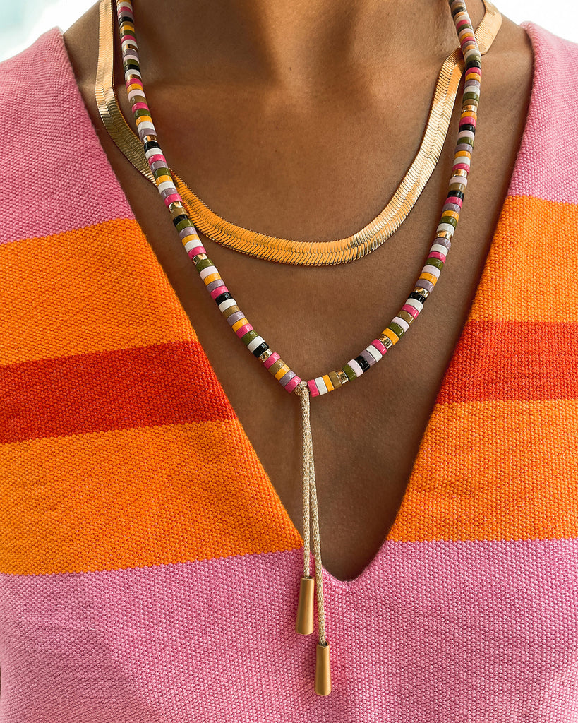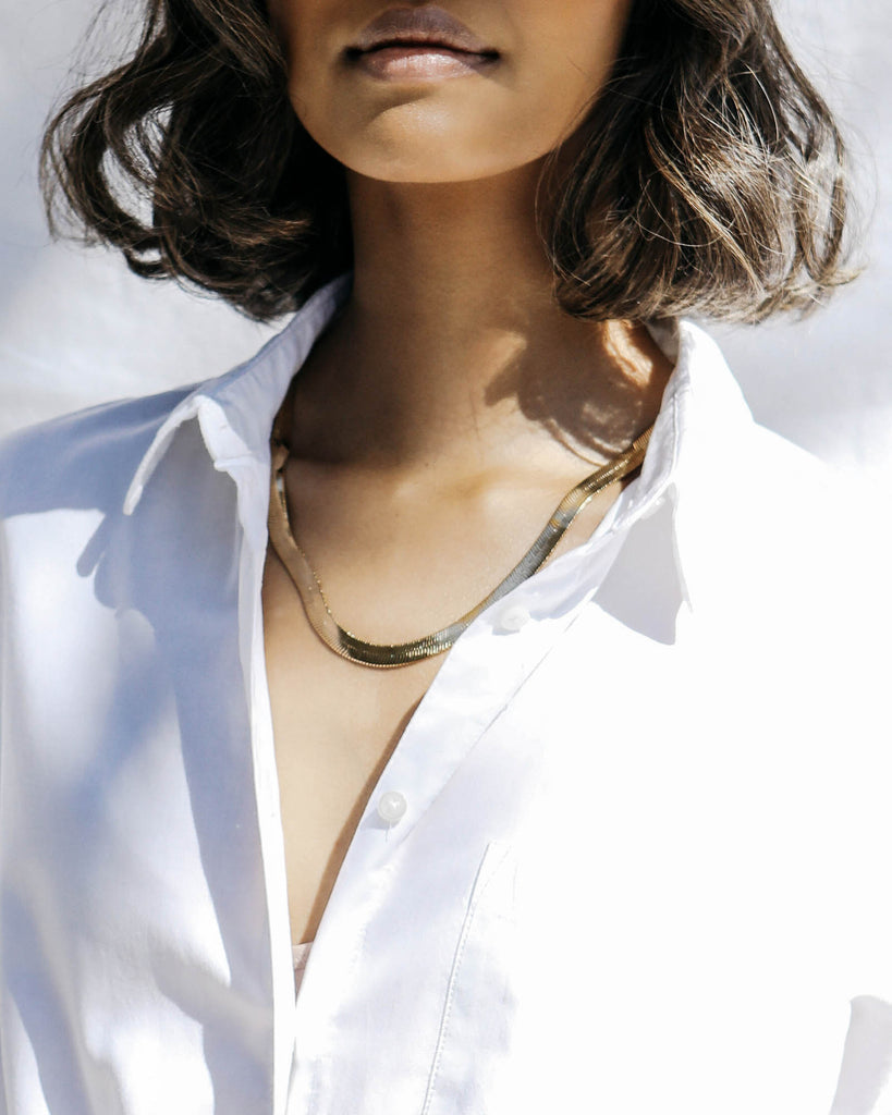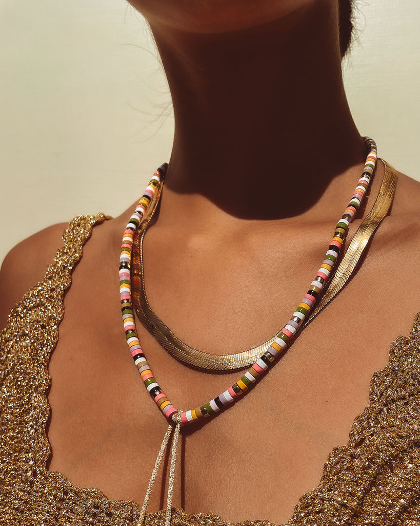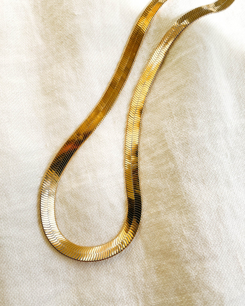 Our gorgeous wide herringbone plated 18k gold chains are back in stock. We love it stacked with our Glisten Cord necklaces but so pretty and shiny on it's own too.