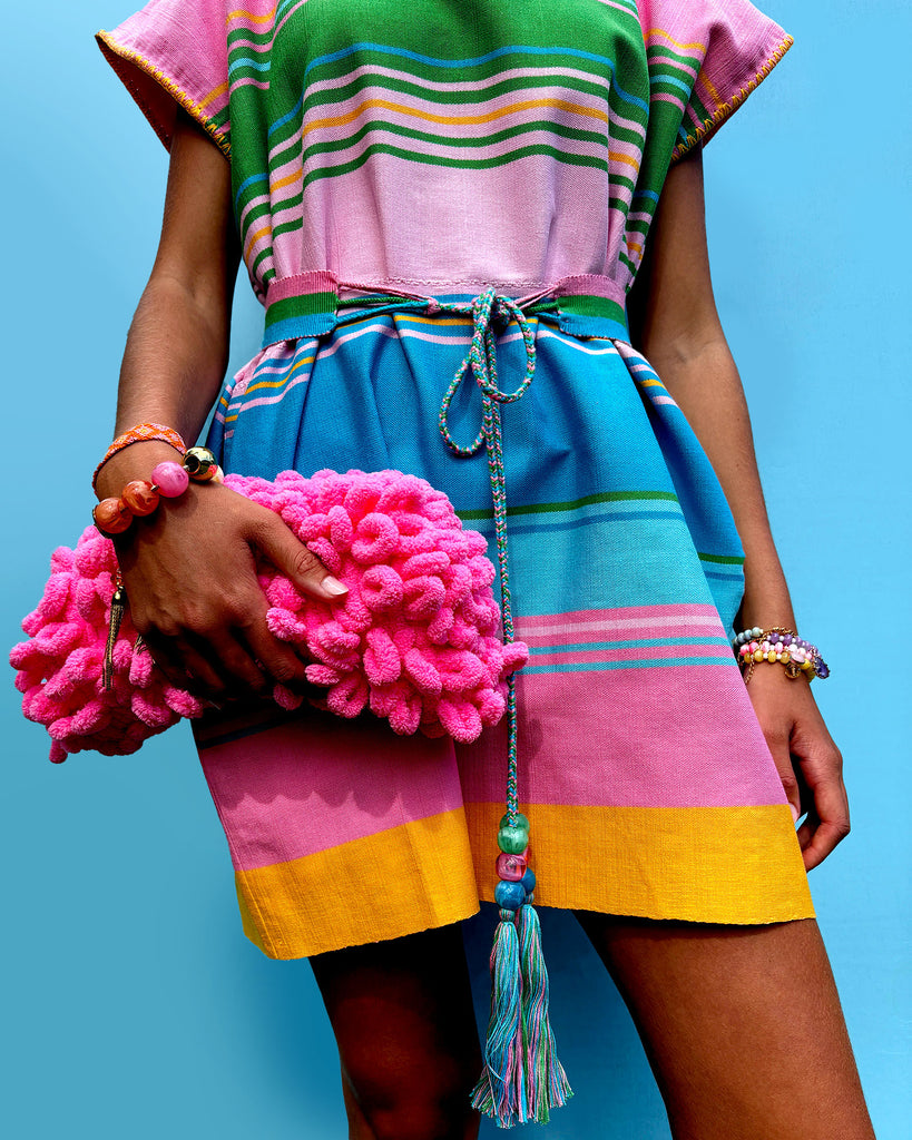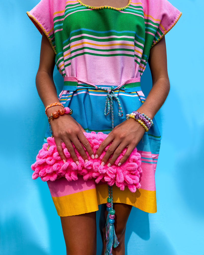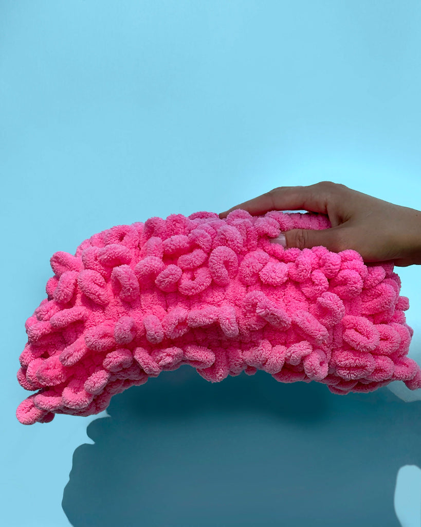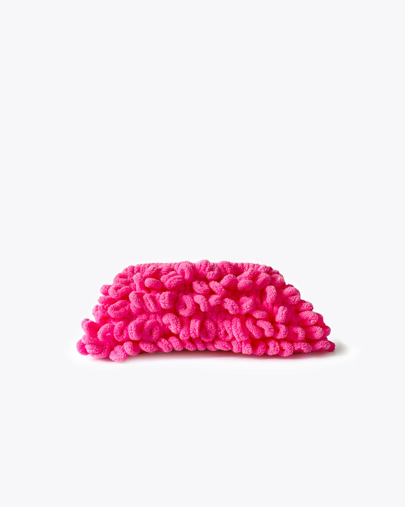 Add a pop of pink to your resort style with this cute clutch. Crocheted in a looped chenille-like yarn this super soft clutch has a strong hinged clasp and is fully lined.