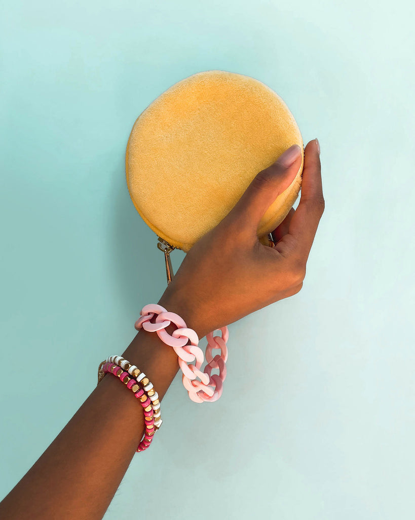 Made from our custom velour - just like our Bucket Hats - these little zip-up, padded velour purses make a cute gift. Great for popping jewellery and cards in at the beach. Lobster clasp at the back to add a chain strap or attach to another bag. Fully lined in bright yellow twill and just the right amount of sponginess to keep everything protected. Easy to wash too.