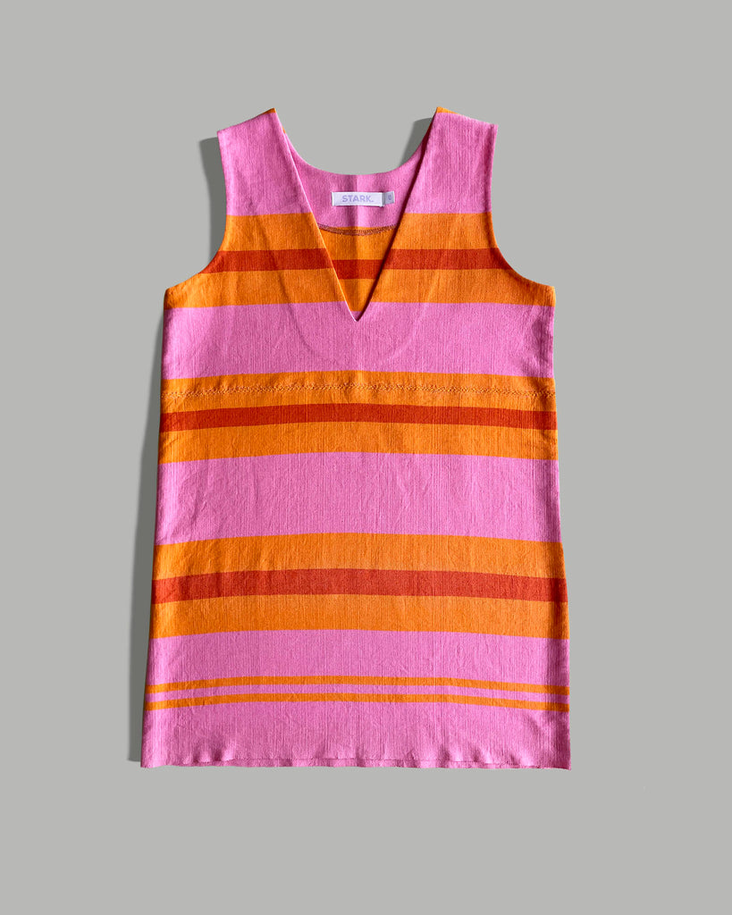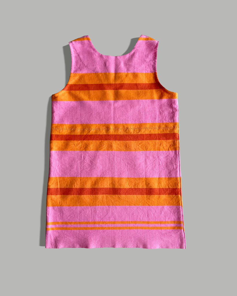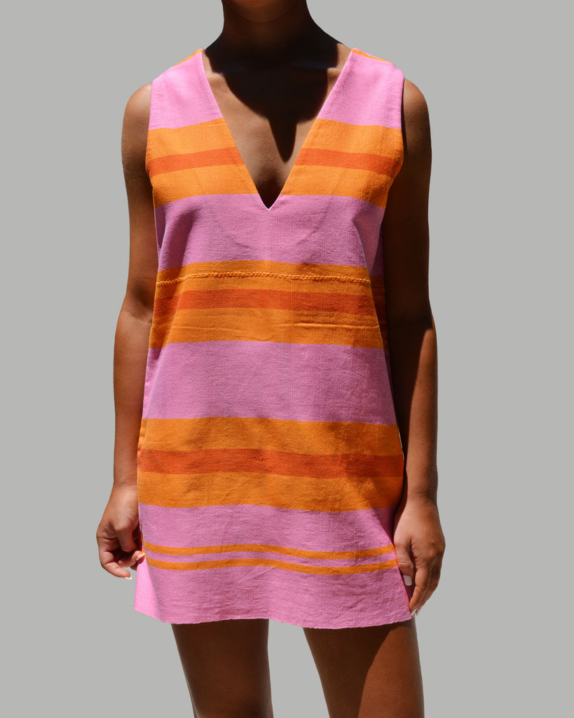 Pretty pink, mango and orange cotton. A plunging V neck, the cute mini shape and hand stitching across the middle add to it's unique summer charm. Perfect for island hopping around The Med this summer.