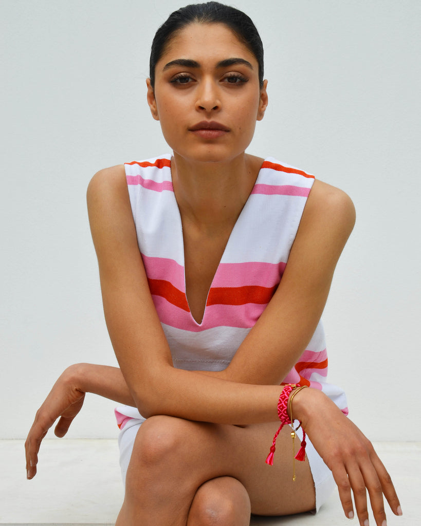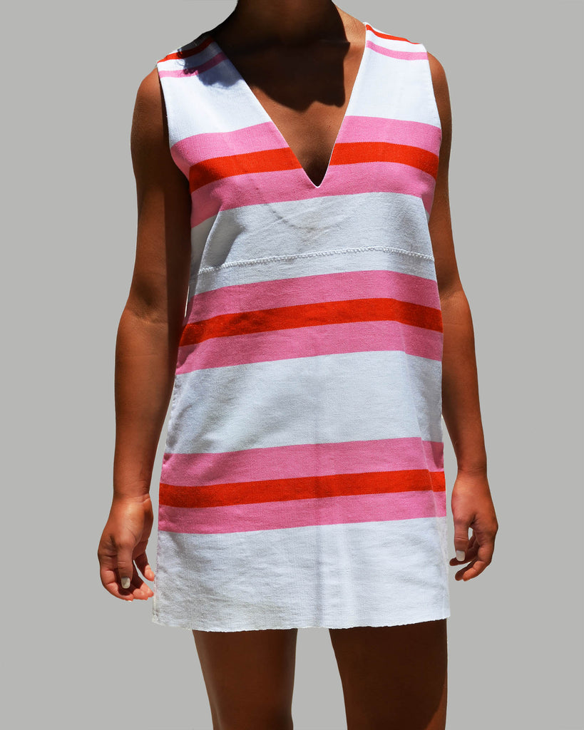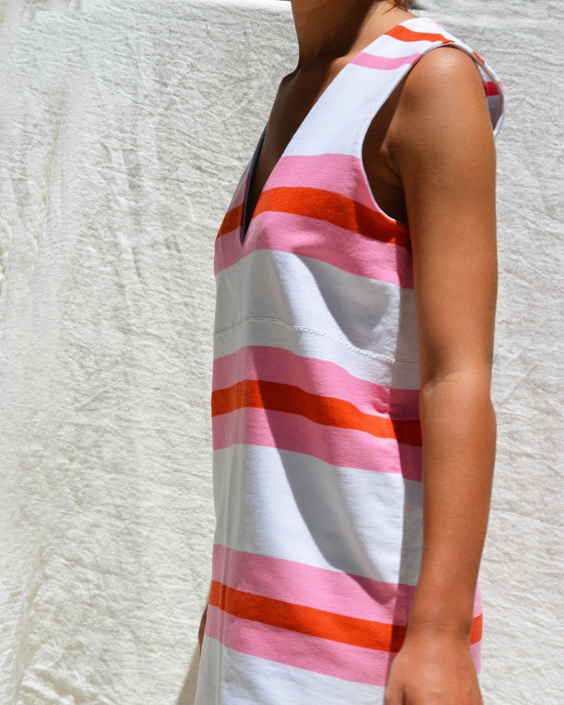 Short and sweet - a cotton tunic made for the sun! With a plunging V neck, the short relaxed shape and hand stitching add to its unique summer charm. Lovely with bare feet, a chunky slide or spiced up with a chic wedge.